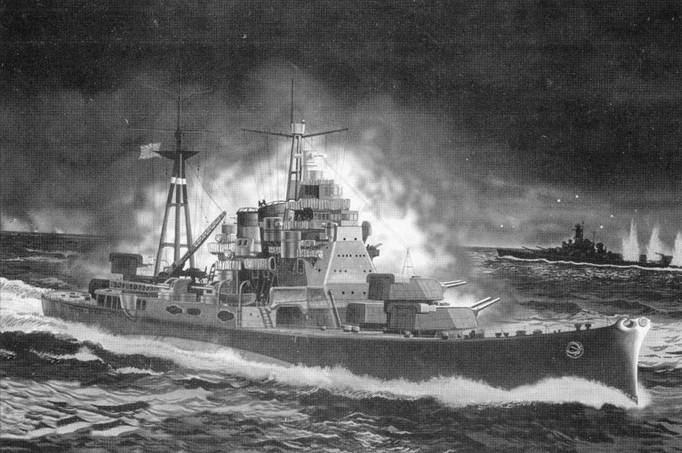 Тяжелый крейсер «Такао» ведет огонь главным калибором по американскому линкору «Южная Дакота», Гуадалканал, ночь с 14 на 15 ноября 1942 г. Крейсеры «Такао» и «Атаги», линкор «Киришима» при выполнении боевой задачи по обстрелу авиабазы корпуса морской пехоты США в Хендерсон-Филд были перехвачены американским линкором «Южная Дакота» и крейсером «Вашингтон». В ночном бою линкор «Киришима» был потоплен, а линкор «Южная Дакота» получил тяжелые повреждения.