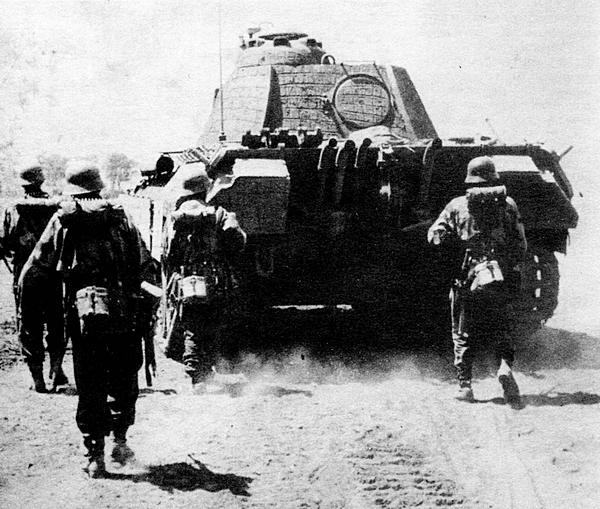 Немецкая пехота сопровождает атакующую «Пантеру». Большие размеры танка обеспечивали пехотинцам надежное укрытие.