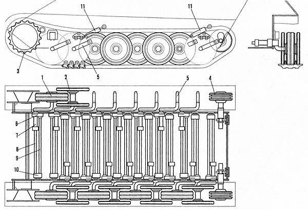 1, 2 — опорные катки, 3 — ведущее колесо, 4 — направляющее колесо, 5 — балансир, 6 — неподвижная муфта крепления торсионов, 7 — втулка торсионов, 8, 9 — торсионы, 10 — подвижная муфта крепления торсионов, 11 — гидравлические амортизаторы.