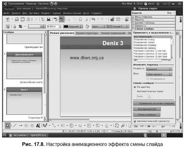 Вкладка Смена слайда (см. рис. 17.8) позволяет настроить как эффект смены слайда, так и время и способ смены слайда. С выбором эффекта, думаю, вы определитесь сами, а мы лучше поговорим о способе смены слайдов.