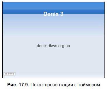 Тип смены слайда — по щелчку или автоматически — задается переключателем Смена слайдов. Как уже было отмечено, время смены слайда на практике будет различным для разных слайдов. Как же узнать, сколько времени нужно на обсуждение слайда? Для этого следует воспользоваться таймером. Выполните команду меню Демонстрация | Показывать таймер. Начнется обычный показ демонстрации. Начинайте комментировать слайд так, как бы вы это делали во время показа. Никуда не спешите, старайтесь четко проговаривать слова (заодно и текст выучите!). В нижнем левом углу экрана вы увидите таймер (рис. 17.9).