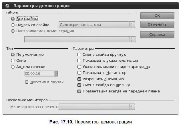 В Impress тоже можно использовать «карандаш». Для этого выполните команду Демонстрация | Параметры демонстрации. В открывшемся окне установите параметр Указатель мыши в виде карандаша (рис. 17.10). После этого вы сможете во время показа рисовать на ваших слайдах все, что захотите.