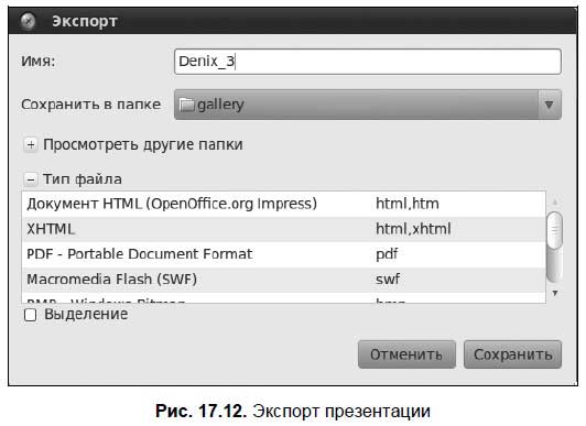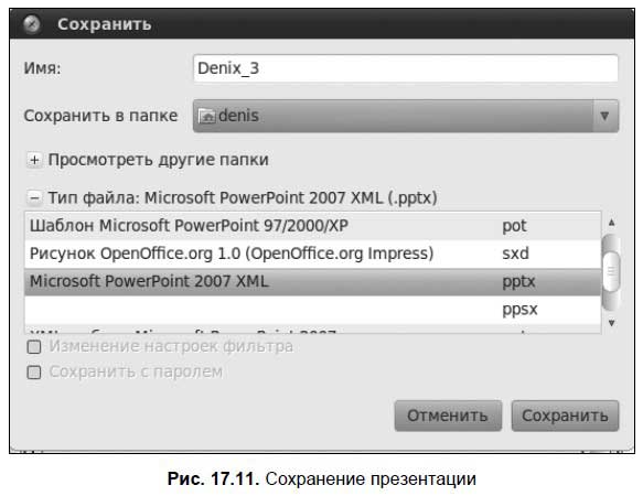 Вы можете сохранить презентацию как во внутреннем формате OOo Impress, так и в формате MS PowerPoint. Для этого при сохранении презентации просто выберите нужный вам формат (рис. 17.11).