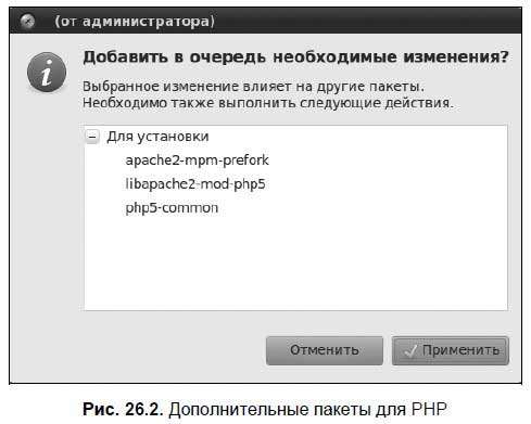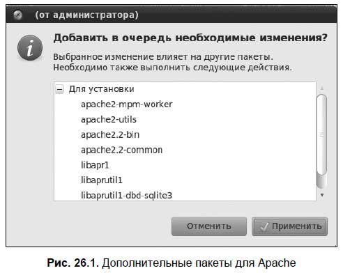 Запустите менеджер Synaptic. В поле Быстрый поиск введите apache. Щелкните правой кнопкой мыши на пакете apache2 и выберите команду Отметить для установки. Менеджер пакетов сообщит вам, что нужно установить дополнительные пакеты (рис. 26.1). Нажмите кнопку Применить.