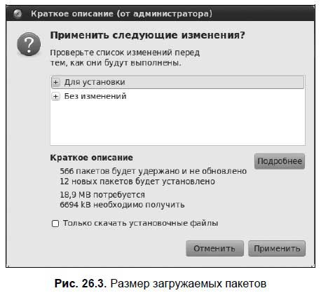 Теперь нажмите кнопку Применить на панели инструментов Synaptic. Размер выбранной мною конфигурации составил 18,9 Мбайт, загрузить из Сети потребуется 6,64 Мбайт (рис. 26.3).