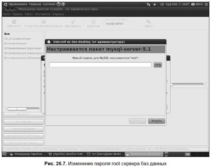 При установке MySQL-сервера Synaptic запросит новый пароль пользователя root (рис. 26.7). Это пароль пользователя MySQL — не нужно путать с системным пользователем root!