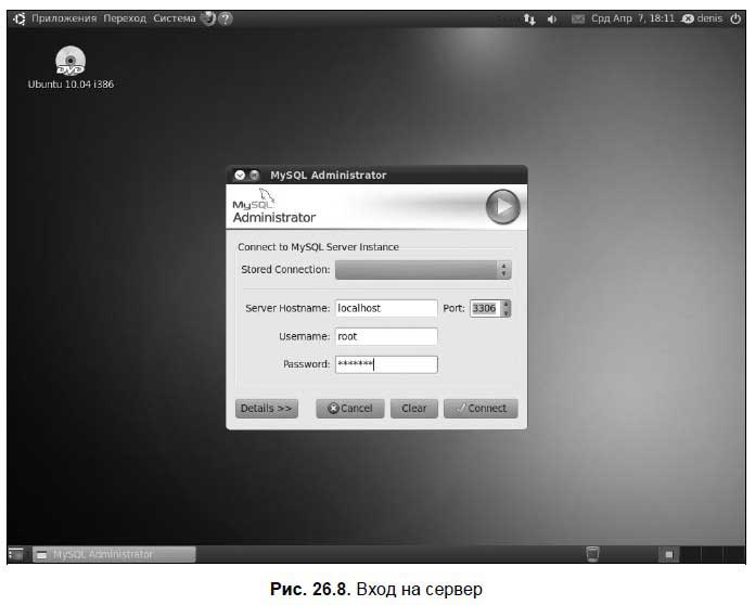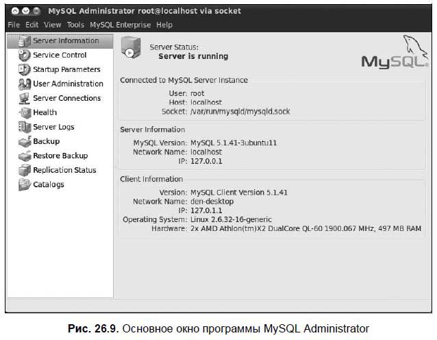 сервер, мы установили программу MySQL Administrator (пакет mysql-admin). Запустите программу командой меню Приложения | Программирование | MySQL Administrator. Укажите адрес сервера localhost, имя пользователя — root, пароль, который вы указали при установке сервера (рис. 26.8), и нажмите кнопку Connect. Далее управлять сервером будет существенно проще (рис. 26.9).Пройдемся по основным разделам программы MySQL Administrator: