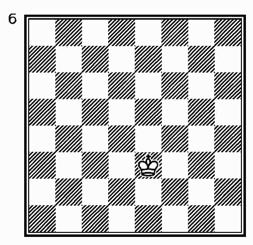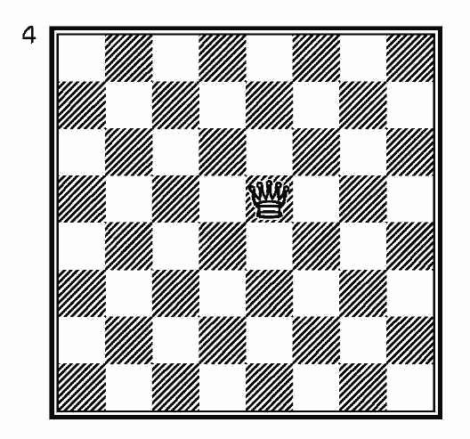 Стоя в центре доски, как на диаграмме 4, ферзь контролирует двадцать семь полей, не считая того, на котором он стоит. Ферзь, безусловно, самая сильная фигура.Конь