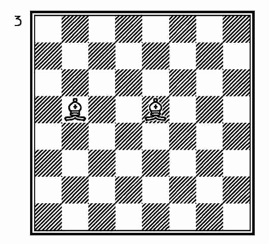 Слон на свободной от фигур доске может переместиться на большее или меньшее число полей в зависимости от занимаемого им положения. На приведенной диаграмме 3 слон, ходящий по белым полям (белопольный слон), может занять девять полей, не считая того, на котором он стоит. Слон же, ходящий по черным полям (чернопольный слон), имеет в своем распоряжении четырьмя полями больше, чем другой, то есть всего он располагает тринадцатью полями, кроме того, на котором он стоит.