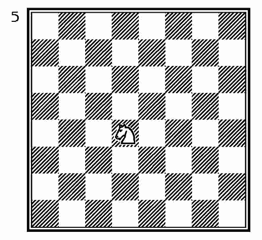 Конь, расположенный на черном поле (d4), может пойти лишь на какое-либо из восьми полей, отмеченных точками. Это значит, что конь всегда попадает с белого поля на черное или наоборот. Это значит также, что конь передвигается на одно поле по вертикали или горизонтали, а затем еще на одно поле по диагонали в том же общем направлении. Можно сказать, что конь ходит на два поля в направлении, среднем между прямым и диагональным (см. точки на диаграмме 5).