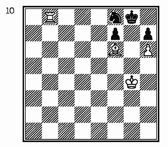 В изображенном на диаграмме 10 положении очередь хода за черными. Черный король не атакован, или, другими словами, он не находится под шахом. С другой стороны, он не может никуда пойти, не попав под шах, что, как сказано выше, не допускается правилами игры. Равным образом черные не могут пойти конем, так как это обнажило бы короля, который оказался бы под шахом от белой ладьи. Таким образом, черные находятся в патовом положении, и игра – ничья.