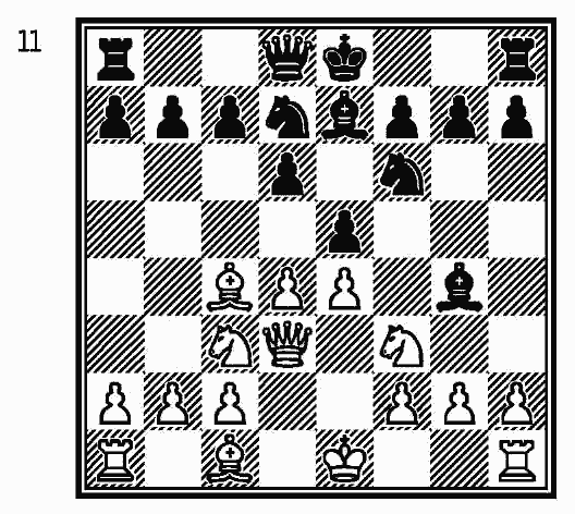 Такую рокировку называют «рокировкой в короткую сторону» или просто «короткой рокировкой». В положении, изображенной на диаграмме 11, рокировка в длинную сторону невозможна из-за того, что один из слонов белых стоит между королем и ладьей.