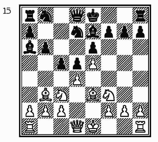 Рокировка невозможна здесь потому, что поле f1 находится под ударом слона черных а6. На всех пяти диаграммах (11–15) черные, если очередь хода за ними, могут рокировать в короткую сторону.