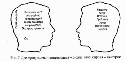 Быстрое чтение в отличие от медленного, пассивного созерцания текста заставляет читателя активно вторгаться в структуру и содержание текста, сравнивать и оценивать различные смысловые блоки.