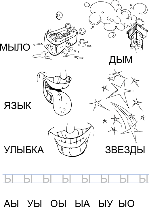 2. Повторяем все названия, выделяя голосом ДЫЫЫМ, МЫЫЫЛО… Показывает вверху страницы изображение звука букву Ы.