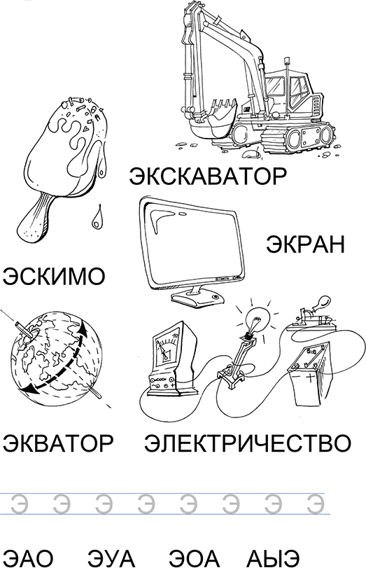 2. Повторяем все названия, выделяя голосом звук: ЭЭЭкскаватор, ЭЭЭскимо… и показываем вверху страницы изображение звука букву Э.