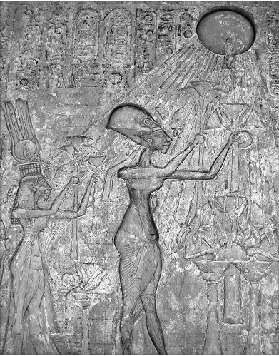 Стела, изображающая Эхнатона и его семью, поклоняющихся Атону или солнечному диску.