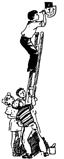 Четверо идут по улице. Четверо несут лесенку, фонарик, баночку с краской и кисточку. Четверо подходят к дому и зажигают фонарики. Электрический луч выхватывает из темноты уличную табличку с надписью «Еленинская». Четверо приставляют к дому лесенку. Один из четверых с кисточкой в руках лезет вверх и смахивает с таблички ненужную букву «Е».