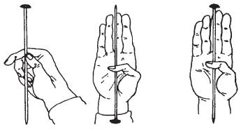 Чтобы передать гвоздю импульс движения руки, необходимо остановиться в тот момент, когда вы выпустите гвоздь из руки. Не забывайте – кисть должна быть неподвижной. Старайтесь целиться немного выше точки, куда должен попасть