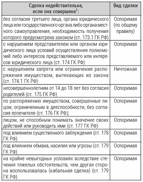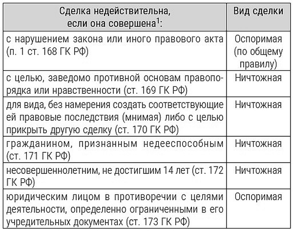 Существует еще такое понятие недействительных сделок, которые подразделяются на оспоримые и ничтожные, в зависимости от того, необходимо ли заявлять требование о признании сделки недействительной либо сделка считается недействительной независимо от такого признания (см. табл. 1). Однако в обоих случаях такая сделка не влечет никаких юридических последствий с момента ее совершения, при недействительности сделки каждая из сторон ее обязана возвратить другой все полученное по сделке, а в случае невозможности возвратить полученное в натуре, возместить его стоимость, если иные последствия недействительности сделки не предусмотрены законом.