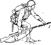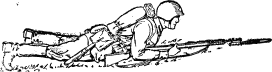 С последним шагом перебежки сделай полный выпад правой ногой вперед и слегка вправо, одновременно поставь левую руку ладонью на землю пальцами к правой ноге и, опираясь последовательно на левую руку и бедро левой ноги, ложись на левый бок (рис. 3). Вслед за этим немедленно повернись на живот, а винтовку одновременно вынеси вперед для заряжания или выстрела.