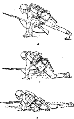 С хода или из положения «лежа» встань на левое (правое) колено, подтяни его возможно больше вперед под живот и, переступая ногами на коленях и руками на предплечьях или кистях (в зависимости от высоты укрытия), передвигайся вперед. Винтовку держи за ремень, затвором кверху. Кисть правой руки сжимай покрепче, прижимая большой палец к цевью.