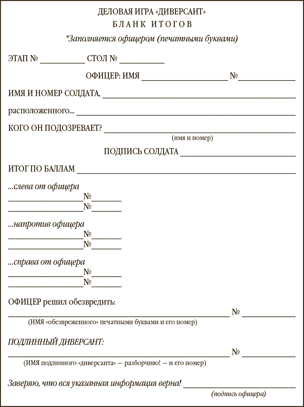 Бланк итогов для деловой игры «Диверсант» (индивидуальная версия)