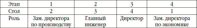 значит, что данный участник на первом этапе будет сидеть за столом № 2 и играть роль заместителя директора по производству, на втором этапе – за столом № 3 и играть роль главного инженера и т. д.Если на первом, втором и четвертом этапах он играет роль подчиненного и может только предлагать, соглашаться или не соглашаться с директором, то на третьем этапе за столом № 4, играя роль директора, он будет сам назначать время проведения совещания.