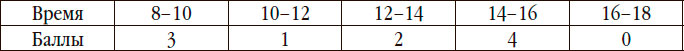 Каждый игрок, изучив свою карточку, акцентирует внимание на наиболее подходящем для себя времени (в нашем примере это период с 14 до 16 ч, в крайнем случае – с 8 до 10 ч).