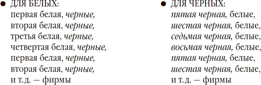 Фирмы, владеющими фигурами одного и того же цвета, ходят по очереди. Поскольку белые и черные фигуры также должны ходить по очереди, то устанавливается следующая нормативная очередность: