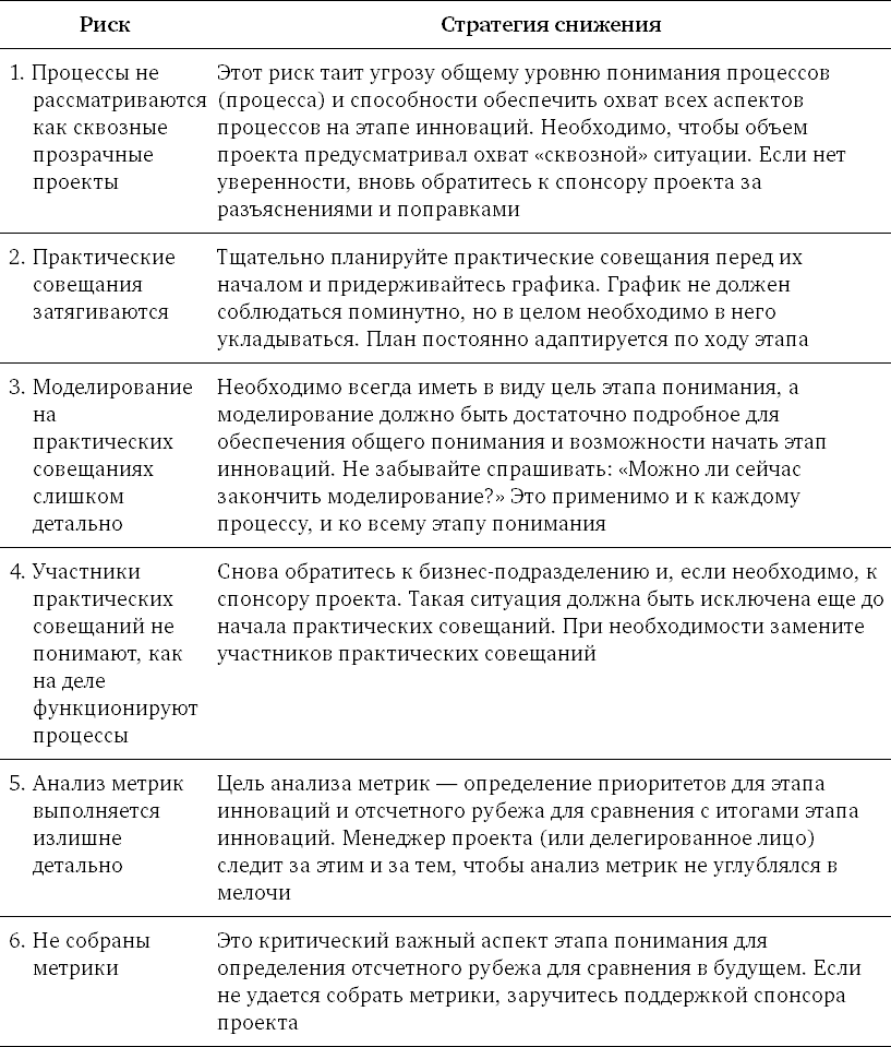 Практические совещания по инновациям часто существенно отличаются от совещаний этапа понимания, поскольку центр обсуждений переносится с регистрации текущего состояния (понимание) на творчество и инновации (этап инноваций). Это означает, что участники совещаний – в основном, менеджеры и лица, принимающие решения.