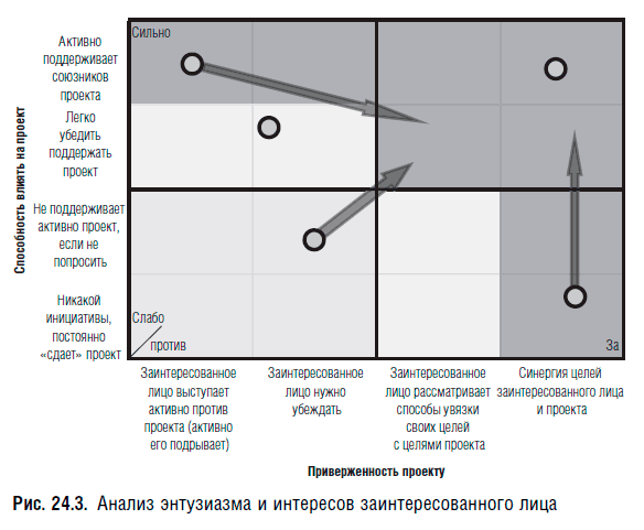 Если должно произойти перемещение заинтересованного лица, менеджеру проекта понадобится разработать стратегию для каждой стрелки на этих двух рисунках. Такая стратегия является комплексом мер, осуществление которых должно обеспечить переход заинтересованного лица на нужную клетку в матрице. И здесь мы подошли к последнему шагу накопления информации о заинтересованных сторонах перед планированием стратегии взаимодействия с ними. Нужно документально оформить результаты, которые хочет видеть в проекте каждая заинтересованная сторона, и сопоставить их с фактическими целями и задачами проекта. Тогда будет видна синергия целей или ее отсутствие.