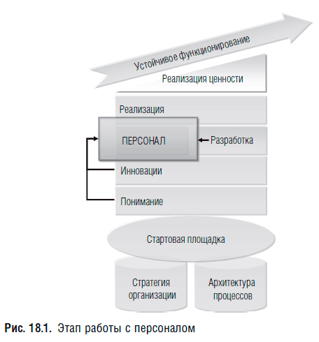 Этап работы с персоналом (рис. 18.1) – наиважнейший этап реализации любого проекта BPM, и если его не выполнить тщательно и на самом высоком уровне, это может поставить под угрозу всю оставшуюся часть проекта. Важно четко понимать отличие данного этапа от этапа внедрения, в фокусе которого находится развертывание выбранного решения. Как правило, этап работы с персоналом идет одновременно с этапом разработки, на котором формируется решение с автоматизацией (или без нее), а на этапе работы с персоналом происходит распределение должностных обязанностей и принимаются решения для оценки функциональных характеристик персонала.