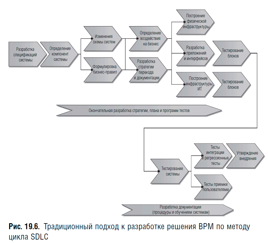 На рис. 19.6 показаны шаги, которые выполняются в традиционном подходе к разработкам решения BPM по методу цикла разработки ПО (SDLC).