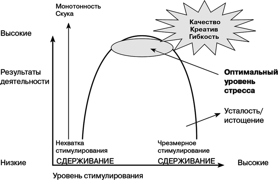 В контексте MBV особенно важно понять, на какие ценности мы опираемся, когда реагируем на стресс «оптимальным образом». Как показано на рис. 2.2, существуют ценности, ассоциирующиеся с высокой производительностью, которые подавляются, когда человеку либо не хватает стимула, либо, наоборот, он чрезмерно увлечен своей работой. Эти ценности включают дружелюбие, креатив, стремление к достижениям или соблюдение обязательств перед компанией. Нехватка стимула оборачивается скукой и монотонностью работы, в то время как чрезмерный энтузиазм может привести к гиперактивности, а следовательно, к усталости и истощению.