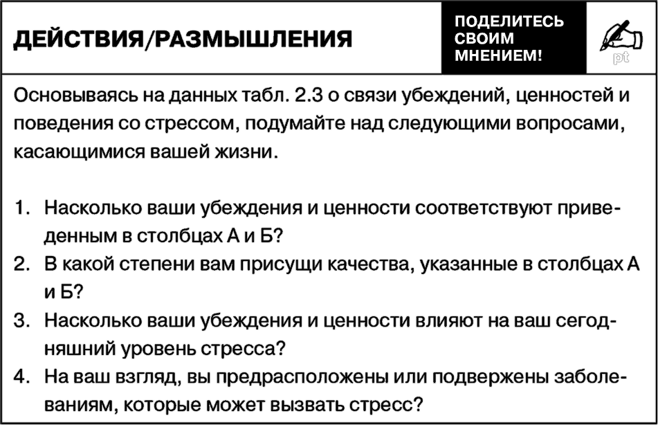 Для изучения причин и последствий поведения А-типа стали проводить масштабные исследования. Например, выяснилось, что люди с подобными качествами склонны сами себе создавать стрессовые ситуации или ухудшать уже существующие. Более того, определенные аспекты личности А-типа (гнев, враждебность и агрессия) приводят не только к чрезмерному стрессу, но и к сердечным приступам. Следует отметить, что ценности сами по себе нельзя назвать ни плохими, ни хорошими, а их отрицательные или положительные последствия обусловлены отношением к ним самого человека. Например, один человек, который любит власть, может проявлять эту ценность через доминирование над другими или их контролирование либо через упорное стремление к материальному обогащению. А другой человек, также любящий власть, может использовать ее благоразумно для достижения целей компании или создания беспристрастной и справедливой рабочей атмосферы. В табл. 2.3 показано, как убеждения и ценности могут привести к пагубным поведению и последствиям (А), и как можно изменить их, чтобы обеспечить позитивные поведение и последствия (Б).