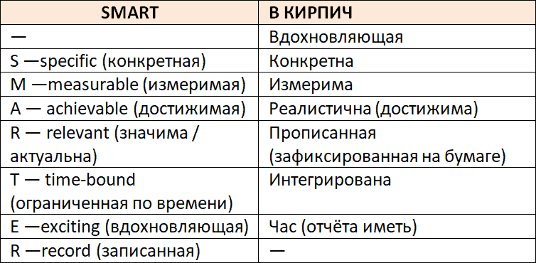 Русский аналог SMARTER называется «В кирпич» и сформулирован чемпионом мира по тхэквондо Андреем Сёганцевым.