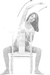 4. Выдыхая, подтяните пупок к позвоночнику и тянитесь к верхнему углу комнаты, направляя движение из тазобедренного сустава через талию, прочно удерживая ягодицы на сиденье стула и сохраняя прямой угол бедер. Тянитесь медленно, потом расслабьтесь. Выполните это движение три раза, вдыхая, когда тянетесь, и выдыхая, когда расслабляетесь.