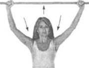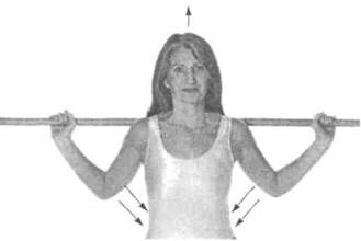 1. Вдыхая, поднимите шест, предоставляя кистям и шесту вести за собой руки и плечи. Старайтесь сохранять плечи раскованными, не позволяйте им подниматься к ушам. Мысленно представляйте, как они опускаются с поднятием рук. Движение должно начинаться из лопаток.