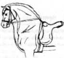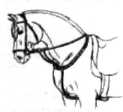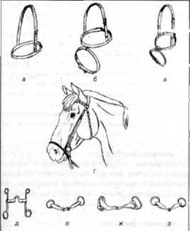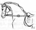 — ганноверский — узкий наносный ремень расположен на два пальца выше начала ноздрей, а ремешок, проходящий в подбородной ямке, лежит на трензельном грызле (рис. 6, б);