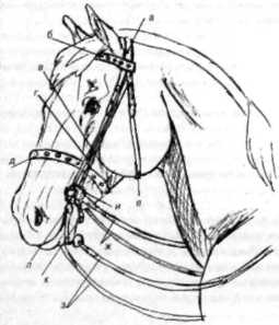 — ирландский — толстые ремни, наносный лежит посередине между углом рта и скуловым гребнем, „сопля“ — в подбородной ямке поверх грызла (рис. 6, г).