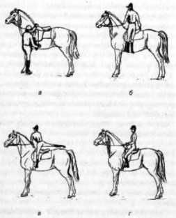 тем, как спешиться с лошади, выньте ноги из обоих стремян, и только после этого перекиньте через седло правую ногу и, опираясь о переднюю луку ладонями, спрыгните с лошади на левую сторону. Повод при этом держите в левой руке. Не выпускайте его, пока не заведете лошадь на место, не расседлаете ее и не снимете уздечку, убедившись, что лошадь никуда не убежит. Затем огладьте, угостите сахаром, морковкой или сухариком. Не скупитесь на поощрение лошади (ласково похлопайте ладонью по шее, скажите ей добрые слова) и во время езды, если она хорошо работает, слушается вас.Рис 12. Посадка всадника на лошадь