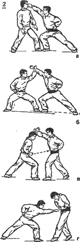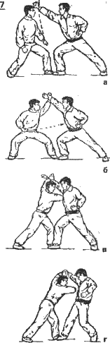 Б — приняв левую стойку лучника, наносит удар кулаком в голову А (рис. 7 а).