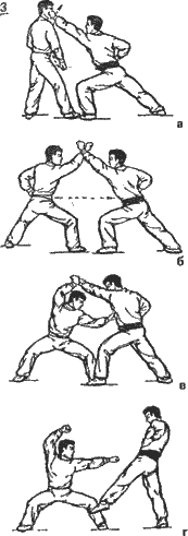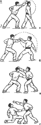 А — сгибая ноги и опускаясь на левое колено, уходит от удара в голову (рис. 6 г).