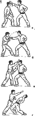 Б — перенеся вес на правую ногу, сгибает колени и, отклонившись туловищем назад, уходит от удара А (рис. 4 г).