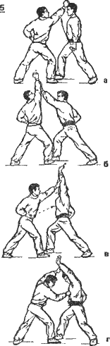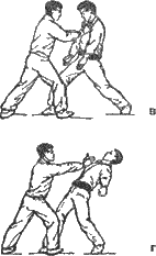А — отступая правой ногой назад и удерживая левой рукой левую руку Б, наносит кулаком правой руки прямой удар в грудь Б (рис. 5 г).