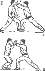 А — не прекращая действия, правой ногой делает шаг вперед и ставит ее между ногами Б. Одновременно, разведя кулаки Б немного в стороны, наносит в грудь Б резкий толчок двумя ладонями (рис. 8 в).