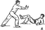Б — переносит вес на левую ногу и, выполняя движение «падение на спину», уходит от толчка А (рис. 8 г, д).