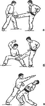 А — продолжая предыдущее действие, правой ладонью «захватывает» плечо Б. Одновременно правой ногой проводит подсечку под левую голень Б и опрокидывает на землю (рис. 10 в, г, д).