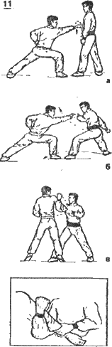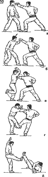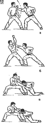 Б — опустив правую ногу вниз, сгибает колени и, отклонившись назад, уходит от удара (рис. 9 в).